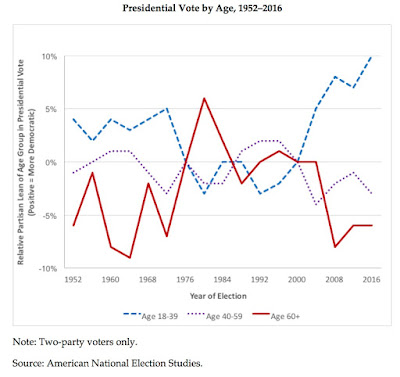 But a much bigger, though less well-promoted, generation gap is happening right now. The difference in political loyalties between younger and older Americans is both larger and more consistent today than it was during the golden age of boomer self-mythologization: